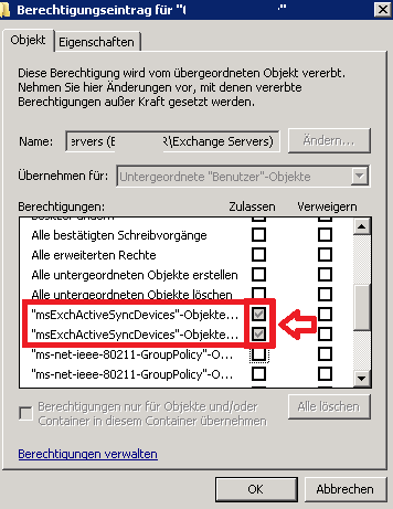 Alternativ kann man der Benutzergruppe Exchange Servers die passenden Rechte vergeben: